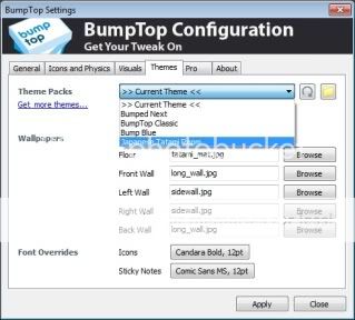 Setelah itu akan muncul BumpTop settings, pilih tab Themes, kemudian pilih Theme Pack yang telah anda unduh, kemudian klik Apply.